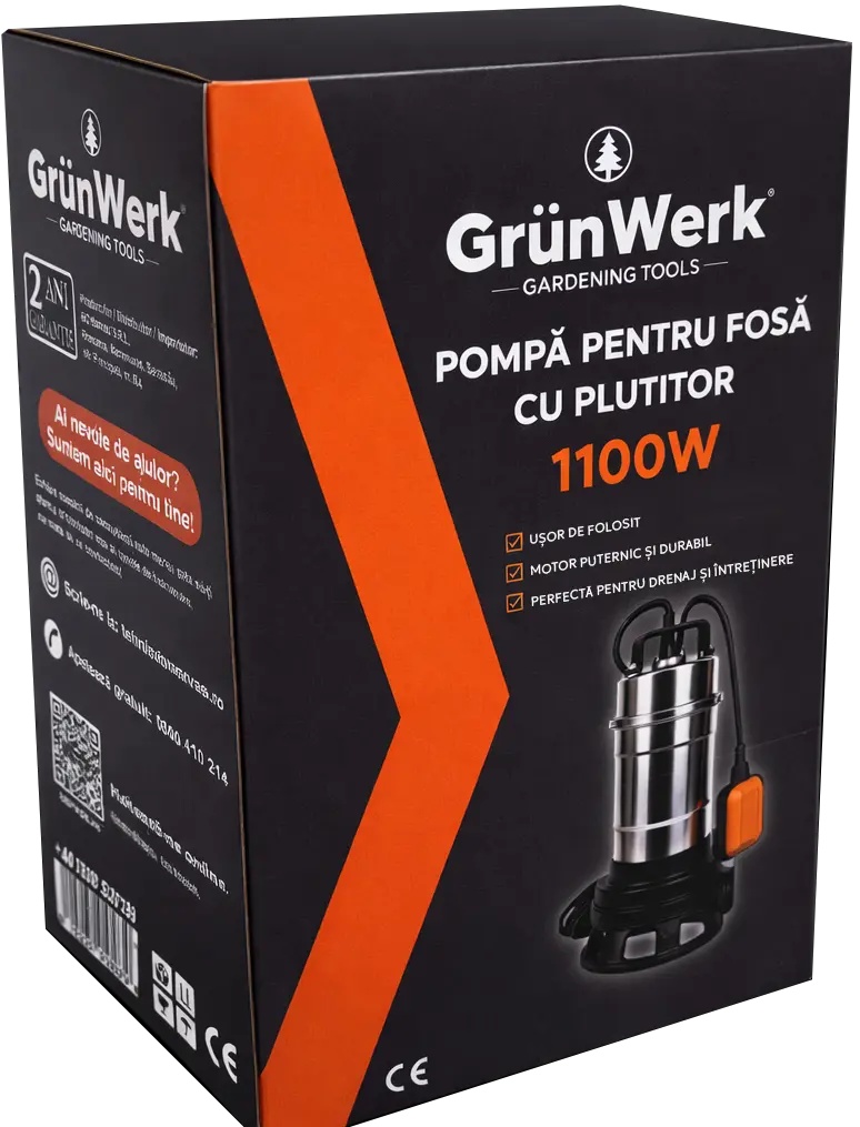 Pompa submersibila apa murdara inox GW GW7181, 1.1kW (1100W), cu plutitor automat, cablu 6.7m, pentru drenaj si evacuare apa cu impuritati Pompa apa murdara inox cu plutitor GW GW7181 1.1kW este o pompa submersibila destinata evacuarii rapide si eficiente a apei cu impuritati din beciuri, fose, rezervoare, santiere sau alte zone inundate. Carcasa din otel inoxidabil ofera rezistenta excelenta la coroziune si uzura, fiind potrivita pentru utilizare intensiva in medii umede sau agresive. Echipata cu plutitor automat, pompa porneste si se opreste in functie de nivelul apei, asigurand protectie impotriva functionarii in gol si optimizand consumul de energie. Motorul de 1100W (1.1kW) garanteaza performanta constanta si capacitate ridicata de drenaj in aplicatii solicitante. Lungimea cablului de alimentare de 6.7 m permite instalare flexibila in bazine, fose sau rezervoare, iar montajul submersibil asigura utilizare directa in apa murdara. Specificatii tehnice: Model: GW GW7181 Tip pompa: submersibila pentru apa murdara Putere: 1100W (1.1kW) Material carcasa: otel inoxidabil Sistem functionare: cu plutitor automat Lungime cablu alimentare: 6.7 m Montaj: submersibil Utilizare: evacuare apa murdara cu impuritati Inaltime: 41 cm Latime: 18 cm Circumferinta: 40.5 cm Avantaje: Carcasa inox rezistenta la coroziune Pornire si oprire automata prin plutitor Performanta stabila in conditii dificile Ideala pentru drenaj si golire rapida Intretinere usoara si durata mare de viata Utilizari Pompa apa murdara inox cu plutitor GW7181 este recomandata pentru: Evacuarea apei din subsoluri si beciuri inundate Golirea foselor si rezervoarelor Drenaj pe santiere Aplicatii agricole si gospodaresti Transfer apa murdara cu impuritati Prin motorul de 1.1kW, constructia din inox si sistemul automat cu plutitor, pompa submersibila GW GW7181 ofera fiabilitate, rezistenta si eficienta in aplicatii de evacuare apa murdara.