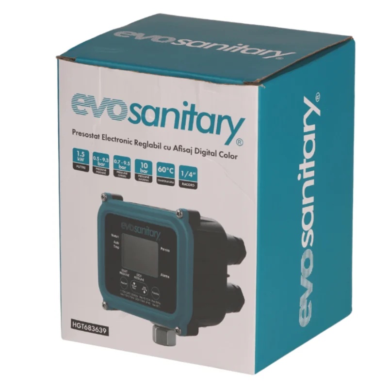 Presostat electronic digital cu afisaj color, 220-240V, 1.5kW (10A), presiune reglabila 0.5–9.5 bar, filet 1/4", IP65, temperatura max 60°C Presostatul electronic digital cu afisaj color este un dispozitiv modern destinat controlului automat al pompelor de apa in sisteme rezidentiale, agricole sau aplicatii semi-industriale. Echipat cu ecran digital color si senzor electronic de presiune, acest presostat permite reglaj precis al valorilor de pornire si oprire, oferind monitorizare in timp real a presiunii din instalatie. Cu o putere maxima suportata de 1.5 kW (1500W) si curent maxim de 10A, dispozitivul este compatibil cu majoritatea pompelor de suprafata si sistemelor de hidrofor. Domeniul extins de reglaj al presiunii, intre 0.5 si 9.5 bar, permite adaptarea exacta la cerintele instalatiei. Carcasa cu grad de protectie IP65 asigura rezistenta la praf si jeturi de apa, fiind potrivit pentru montaj in camine tehnice sau spatii cu umiditate ridicata. Racordul hidraulic cu filet interior 1/4", prevazut cu sistem rotativ, faciliteaza instalarea si orientarea corecta a afisajului. Specificatii tehnice: Tip produs: presostat electronic digital cu afisaj color Tensiune alimentare: 220–240V Putere maxima pompa: 1.5 kW Curent maxim: 10A Domeniu reglaj presiune pornire: 0.5 – 9.3 bar Domeniu reglaj presiune oprire: 0.7 – 9.5 bar Racord hidraulic: filet interior 1/4", rotativ Temperatura maxima de lucru: 60°C Grad protectie: IP65 Interfata: ecran digital color Avantaje: Reglaj precis si control digital al presiunii Afisaj color pentru monitorizare clara in timp real Protectie IP65 pentru medii dificile Inlocuieste presostatele mecanice clasice Instalare usoara si configurare intuitiva Utilizari Presostatul electronic digital 1.5 kW IP65 este recomandat pentru: Sisteme automate de alimentare cu apa Instalatii hidrofor rezidentiale Sisteme de irigatii Pompe de suprafata si submersibile de pana la 1.5 kW Aplicatii semi-industriale usoare Prin controlul digital, domeniul larg de reglaj si protectia IP65, acest presostat electronic ofera siguranta, precizie si automatizare moderna pentru orice sistem de pompare a apei.